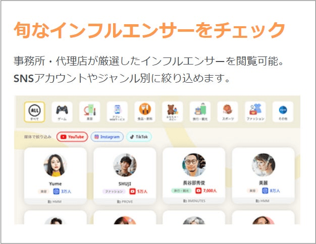 事務所・代理店が厳選したインフルエンサーを閲覧可能。SNSアカウントやジャンル別に絞り込めます。