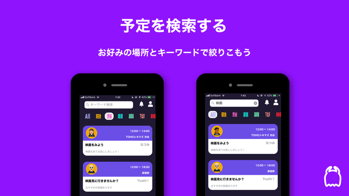 「飲み会」「BBQ」「映画」などのキーワードで検索できるほか、「現在地」「地名」をタップすれば、当てはまる地域の予定を絞り込める機能もあります。