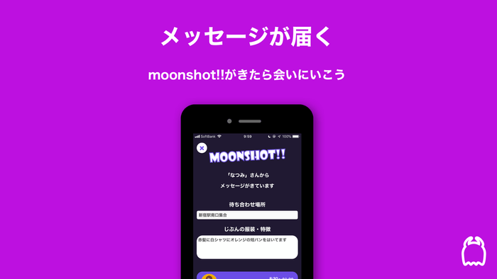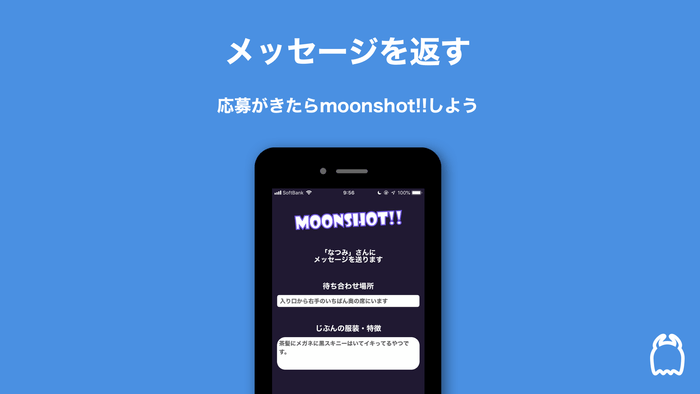 応募は、他のユーザーの募集をタップしたあと、相手から「moonshot!!」と呼ばれる”採用通知”のメッセージが届いたら確定となります。