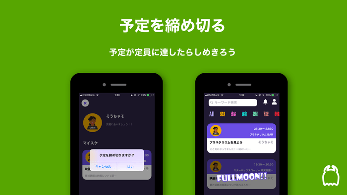 前もって予定を立てる時間や余裕がない人にも「moonsideで今すぐ予定をつくる体験をしてほしい」と考えています。