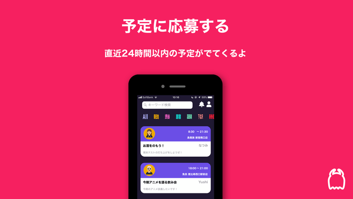 暇な休日や空き時間に感じる「寂しい」「人と会いたい」という気持ちのままに使うことのできることを大切に設計しており、下記のような思いを抱くことがある人に強くおすすめできるアプリケーションです。