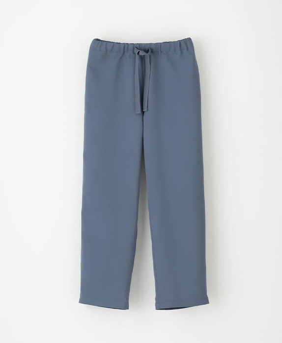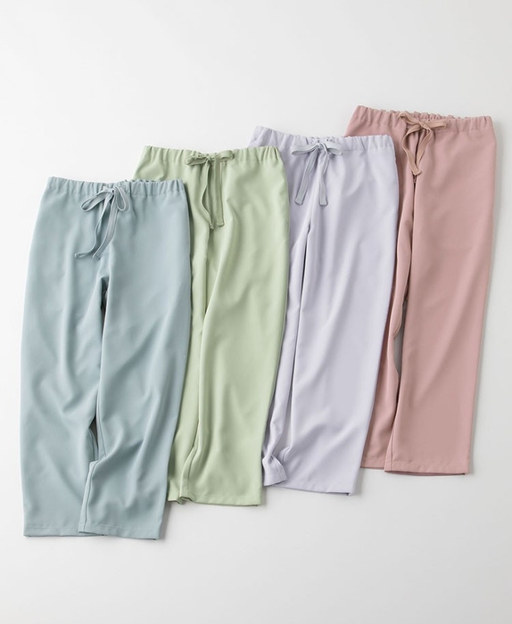 パンツは、ストレートなシルエットと太めの腰紐がアクセント。カジュアルすぎず、上品な佇まいを演出します。