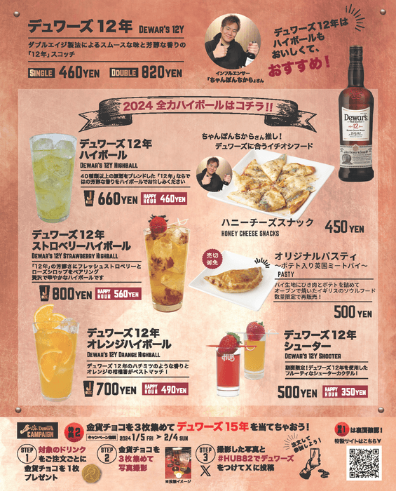株式会社ハブ(本社:東京都千代田区、代表取締役社長:太田 剛)は、HUB・82で販売中の「Dewar's 12年」を使用した「デュワーズ12年キャンペーン」を2024年1月5日(金)から2月4日(日)の期間で開催いたします。昨年度、好評をいただいたDewar's Triple Campaignに加え、今回はインフルエンサー ちゃんぽんちから氏とのコラボレーションを企画しております。