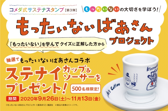 期間中、ドリンクのご注文1杯につきスタンプを1個押印。スタンプを5個集め、「もったいない」を学んでクイズに正解した方から抽選で500名様に、作者の真珠まりこさんに特別に描き下ろしていただいた有田焼の「もったいないばあさんコラボ ステナイカップ(*1)&ソーサー」をプレゼント。今回で3回目となる「コメダ式サステナスタンプ」は、紙のスタンプカードを配布せず、スマートフォンのコメダアプリを活用したデジタルスタンプで、紙の削減にも貢献をします。このスタンプを通して「もったいない」を学ぶことで、資源と環境の大切さを考えるきっかけになっていただきたい。コメダが大切にしている“くつろぎ”をお客さまに提供し続けるためのコメダらしいサステナビリティ活動の一つとして定期的に実施予定です。