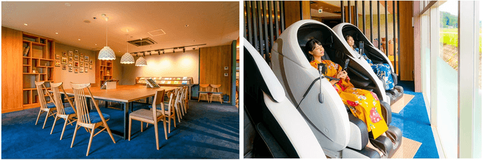 右:ライブラリーラウンジ窓側に設置された高性能マッサージチェアも無料でご利用いただけます。至福のリラックスタイムをお楽しみください。
