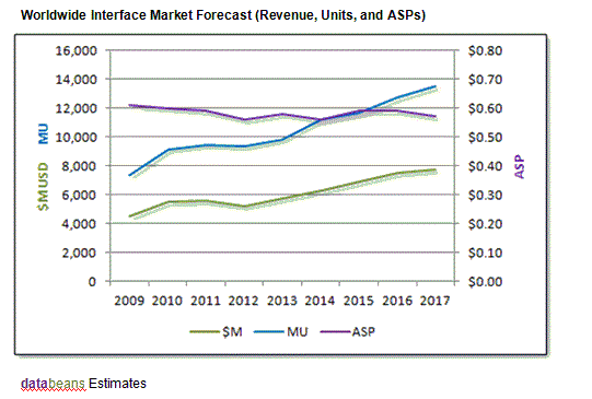 世界のインターフェース市場は、2010年から2012年にかけてほぼ横ばいの収益成長となり、出荷量のみ僅かに成長が見られました。データビーンズでは、2012年の売上高は、2011年にくらべ6%下落して、52億米ドルになると予測しています。