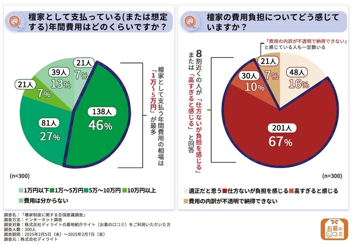 檀家の年間費用は「1万〜5万円」支払っている人が最も多く、8割近くの人が「仕方ないが負担を感じる」または「高すぎると感じる」と回答