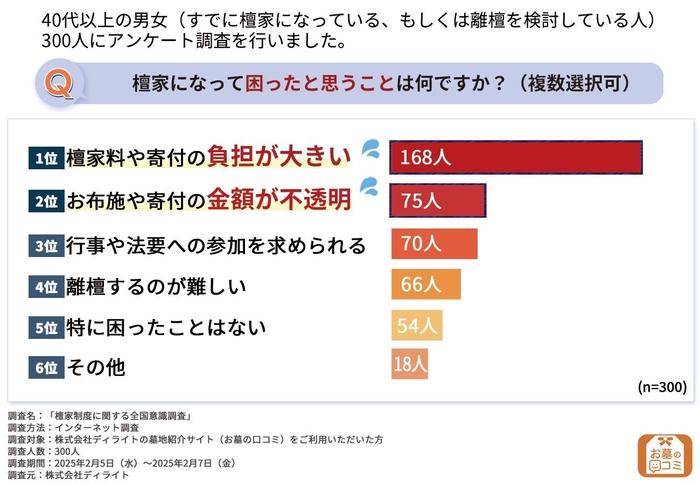 檀家のデメリットとして「檀家料・寄付の負担が大きい」(168人)がトップ