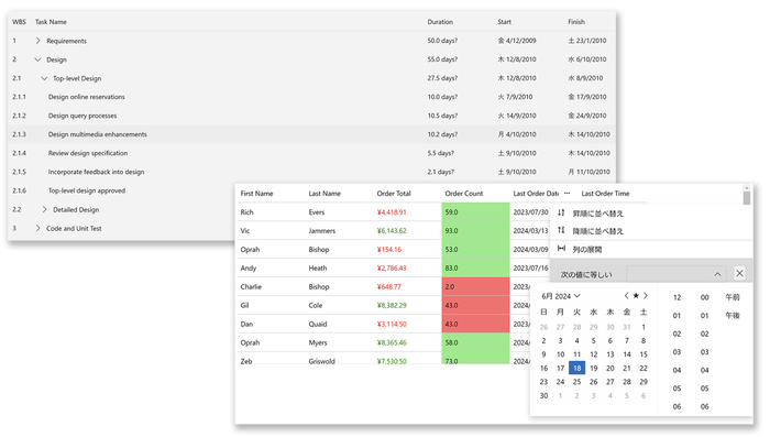 また、BlazorエディションのFlexGridでは、独自のカスタムフィルターを表示できる機能を追加しました。さらに、日時形式でフォーマットされた列に対して、日付値に加えて時刻値でのフィルタリングも可能になりました。フィルター機能が一層強化され、システム利用者はデータ検索や分析をより効率的に行うことができます。