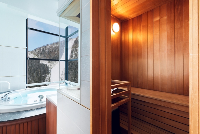 1 客室のプライベートサウナと展望ジェットバスで心身をととのえられる