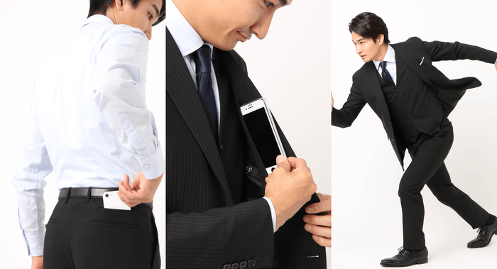 本商品の特徴は、ジャケットとパンツそれぞれに「スマホポケット」を装備していることです。今回の調査で、約30%の方がスマホを複数台所持していることがわかりました。複数のスマホを快適に出し入れできるポケットに加え、スーツを選ぶ人が抱えている「座る時にスマホが邪魔になる」「上着を着ない夏場、パンツのポケットに物を詰め込み過ぎてかさばる」といった悩みにも対応しています。