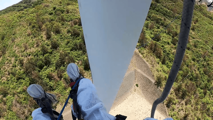作業に必要な15kgもの器具を装着し、風車内部にある作業用のエレベーターで地上80mの“ナセル”と呼ばれる場所まで上がり、命綱をたよりにブレードの側面を滑るように下りていく島田さん。風車に上がってから1時間かけて、ようやく地上約40mの位置にある先端5mに到着しました。