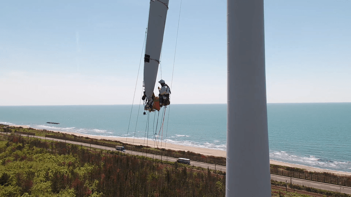 高所作業のスペシャリスト、島田翔太さんのこの日の現場は、秋田県由利本荘市沿岸にそびえ立つ風力発電の風車の大きな羽「ブレード」の補強作業。風が強いときには時速300kmほどで回ることから、長期間運転すると空気中の砂や雨、雪などの微粒子と衝突して損傷を受けてしまうため、先端5mの部分に専用の保護シートを貼ってダメージを減らすよう補強をしていきます。