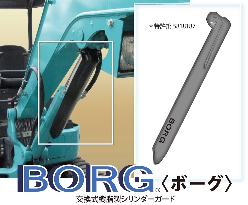 当社は半世紀以上にわたり建設機械の修理、メンテナンスと各種建設機械の作業機、アタッチメントの研究開発を続ける老舗企業です。樹脂製シリンダーガード「BORG(ボーグ)」は、日本の各建設機械メーカーの大小様々な油圧ショベルの修理やメンテナンスを通して、現在の建設工事現場のかかえる問題のひとつにシリンダーガードと油圧シリンダーの破損があることに着目したことから生まれた特許取得製品です。当社では研究開発部門の独自のノウハウを駆使し、リサイクル可能なプラスチックであるHDPE素材(高密度ポリエチレン)を用いたオリジナルデザインのシリンダーガードの研究を続け、2016年から試験販売を実施し、実際の工事現場における耐久試験とユーザビリティの調査を行い、現場での使用において十分な耐久性と、損傷時の交換の簡易性を確認し、並行して特許取得と商標登録を行いました。