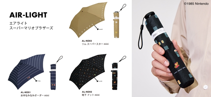軽量生地とカーボンを使用した軽くてしなやかな骨を組み合わせた90gの超軽量傘。ゲーム中でも印象的だった地下ステージや水中ステージをイメージしたデザインや、さりげないスーパースターのデザインをご用意しています。男性でも持ちやすいデザインに仕上がっています。