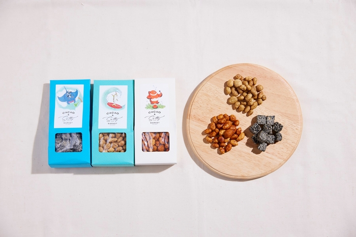 モヒートのおともに「おつまみセット」を用意します。モヒートで使用する甘いラム酒とナッツの適度な塩気が丁度良いおつまみです。小浜島で出会えるマンタやカクレクマノミをあしらったかわいいパッケージのナッツです。