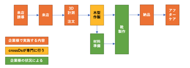 オーダーメイド3Dシューズを提供するためには、次の様な流れで、来店から納品までを行う事になります。当社が自社向けに行っている機能やサービスの必要な範囲を、必要な分だけパートナー企業様にご提供させて頂きます。サービス開始時の立ちあげに際しては、crossDsから事業開始に必要な知識やテクニックなどを企業様のレベルに合わせて伝達し、現場でのレクチャーも必要に応じて行います。パートナー企業様に実施いただく範囲と内容については状況に合わせて適宜調整する事が可能です。
