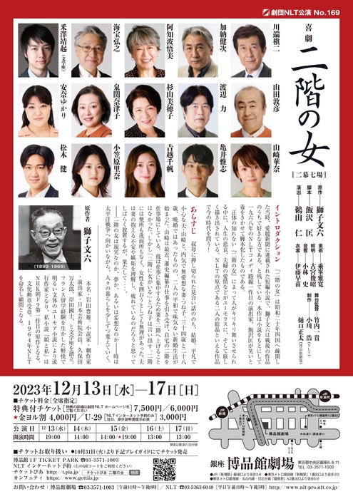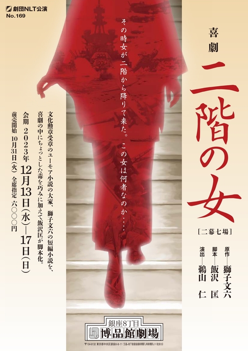 劇団NLT(東京都新宿区、代表:川端槇二)主催、『喜劇 二階の女』が2023年12月13日 (水) ~2023年12月17日 (日)に博品館劇場(東京都中央区銀座8-8-11)にて上演されます。