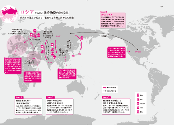 「石油」「石炭」「天然ガス」「再生可能エネルギー」「クリティカルミネラル」「原子力発電」「水素・アンモニア」といった、7つの戦略物資の最新情勢を紹介。視覚的に理解できるように図解した戦略物資のマップを掲載。豊富なデータグラフとともに、わかりやすく解説しています。