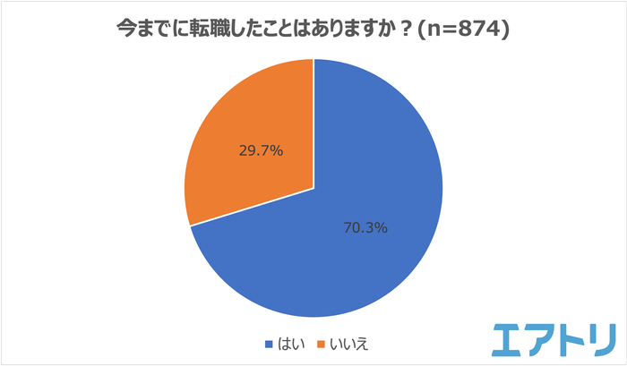 今までに転職をしたことがあるか聞いたところ、「はい」が70.3%、「いいえ」が29.7%となり7割の人が転職経験が「ある」と回答しました。多くの人が最低でも1度は転職の経験があることがわかります。