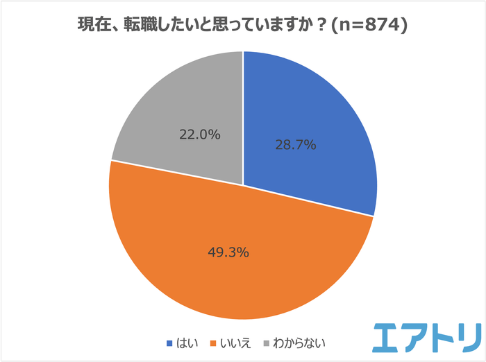 現在、転職したいと思っているかを聞いたところ、一番多かった回答は「いいえ(転職したいと思っていない)」がおよそ半数の49.3%となりました。「転職したい」人は28.7%、「わからない」と回答した人が22.0%となりました。現状の職場で問題ない、と考える人が半数程度いることがわかります。