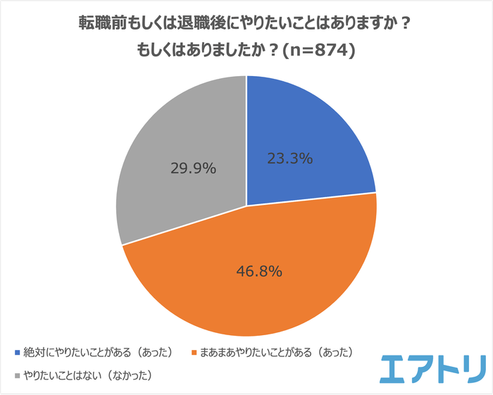 転職前もしくは退職後に「絶対にやりたいことがある(あった)」人と「まあまあやりたいことがある(あった)」人が合わせて70.1%となりました。「やりたいことはない(なかった)」人は29.9%でした。