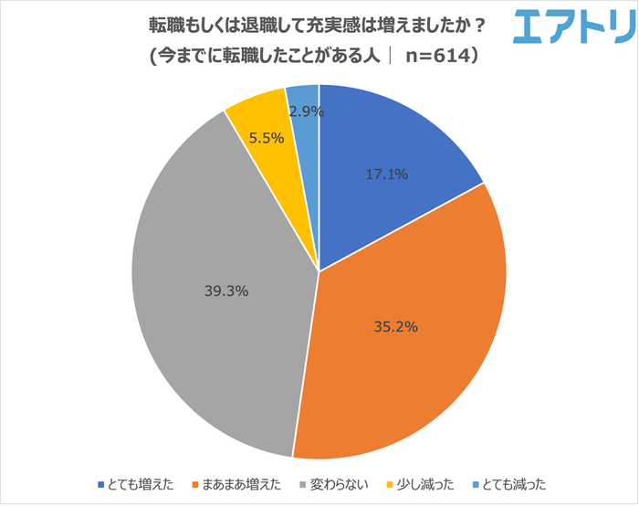 半数以上となる52.3%の人が転職もしくは退職したことで「充実感が増えた」と回答しました。