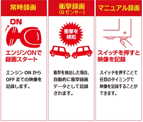 ◆記録方式:常時録画/イベント録画 (衝撃録画/マニュアル録画[手動録画]/後続車接近録画)