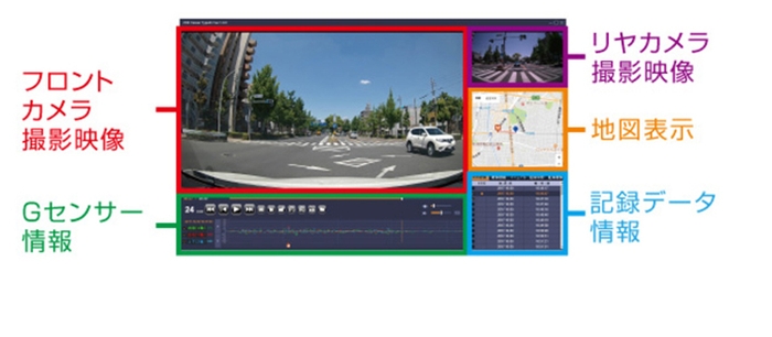 専用ビューワソフトを使用することで録画したデータをパソコンで確認可能。映像や音声だけではなくGセンサーの情報も確認できます。またGPSを搭載しているため、自車の走行軌跡を地図上に表示したり、走行速度も確認できます。