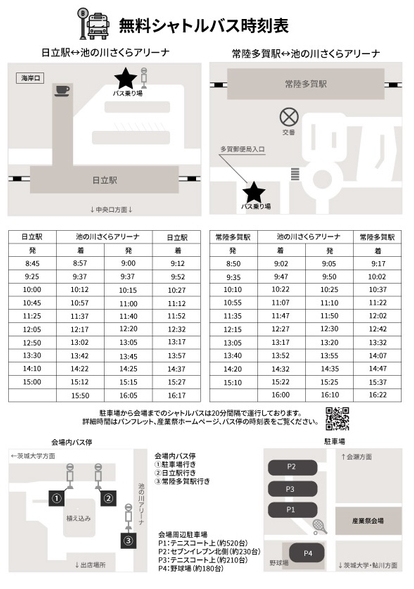 日立駅と常陸多賀駅、臨時駐車場から会場までの無料シャトルバスを運行します。