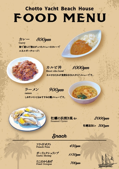 ちょっとヨットビーチハウスでは、BBQを行わない方でも、海の家オリジナルメニューのお食事やドリンクをお楽しみいただけます。