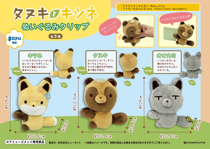 限定プライズゲーム用景品の展開を記念し、「タヌキとキツネぬいぐるみクリップ(全3種)」を抽選で3名様にプレゼントするキャンペーンを開催いたします。