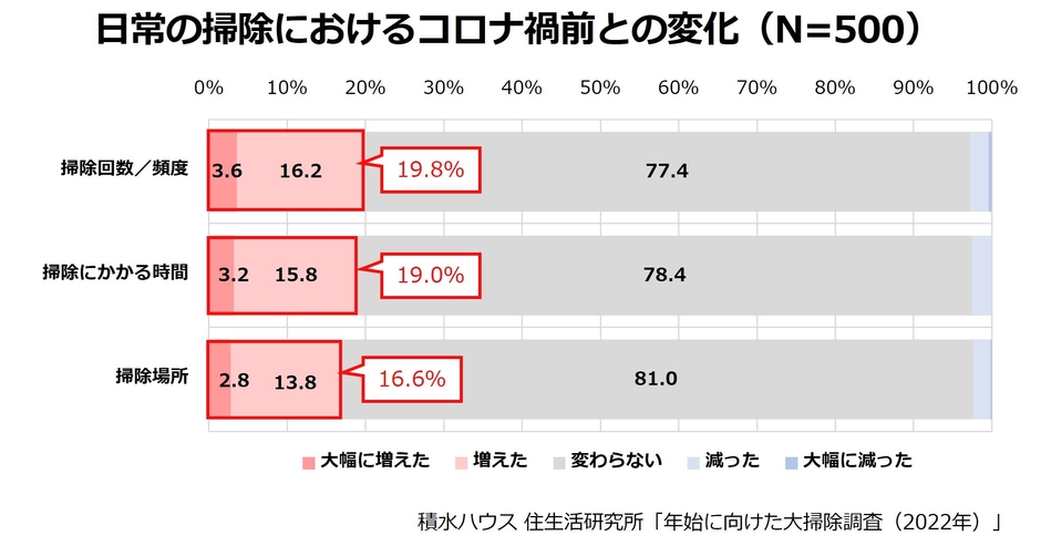 日常的な掃除における回数や頻度、時間、場所の各項目について、コロナ禍前後の増減から、掃除の変化を調査しました。結果、項目のいずれかで約4人に1人(25.6%)が増えたと回答しました。各項目では「大幅に増えた、増えた」と回答した人が、「掃除回数/頻度」19.8%、「掃除にかかる時間」19.0%、「掃除場所」16.6%を占めました。