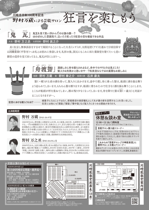 公益財団法人川崎市文化財団主催『野村万蔵による芸能サロン~狂言を楽しもう~』が2025年1月18日 (土)に川崎能楽堂(神奈川県 川崎市川崎区 日進町 1-37)にて上演されます。