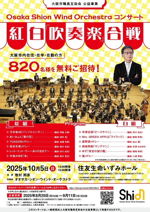 ⼤阪市内在住・在学・在勤の⽅ 820名様を無料ご招待!⼤阪市職員互助会 公益事業『Osaka Shion Wind Orchestra コンサート 紅⽩「吹奏楽」合戦』開催決定! | NEWSCAST