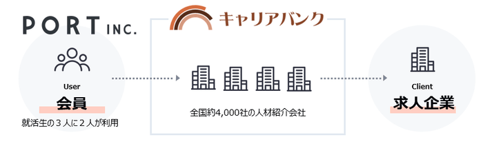 ポート株式会社(代表取締役社長 春日博文、所在地:東京都新宿区、以下:当社)は、キャリアバンク株式会社(代表:平井 伴弥、所在地:東京都中央区、以下:キャリアバンク社)と業務提携契約を締結し、就職領域における効率的な送客先(販路)の拡大のため、人材紹介会社向け送客支援で連携していくことが決まりましたので、お知らせいたします。