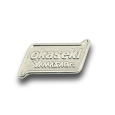 社章は、「右肩上がりに上昇していきたい」という想いを表現した外形に、メーカー元がひと目でわかるように親会社の「YAMASA.Gr」(山佐グループ)、さらに岡山石油を短縮した「okaseki」のロゴが配置されたデザイン。ニッケルメッキでシンプルに仕上げることで、落ち着きのある社章が完成しました。今回の社章製作は営業職からの要望もあったということですが、ご担当の方からも「とても良い仕上がりなので、今後はノベルティグッズやお祝い事などでも発注できればと思います」とのお言葉をいただきました。
