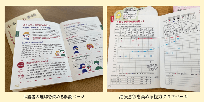治療には治療用メガネが欠かせません。販売とアフターフォローを担当するメガネ専門店が記載するページを設けるなど、関係者が連携しやすい設計が画期的と評価されキッズデザイン賞を2年連続受賞(※2019年2020年)しています。