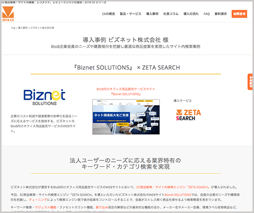 この度、ビズネット株式会社様が運営する、BtoB向けオフィス用品販売サービスのWEBサイト『Biznet SOLUTIONS』にEC商品検索・サイト内検索エンジン「ZETA SEARCH」を導入致しました。
