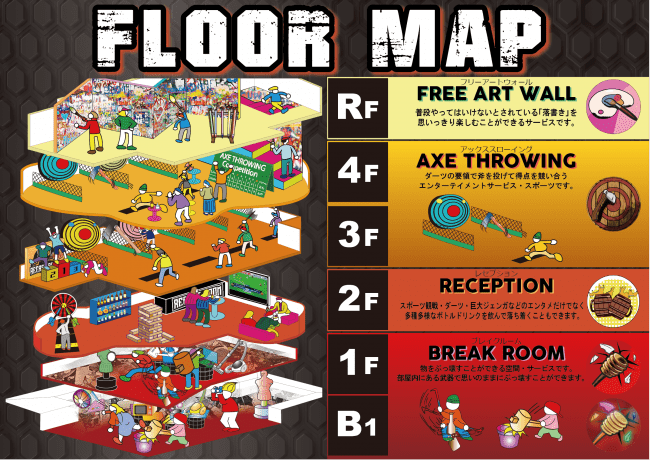今回の新店舗である池袋店は、JR池袋駅東口から徒歩5分ほどの場所にあり、 REEAST ROOMが"ビル一棟"を丸々占拠し、地下1階〜地上4階、屋上付きの合計6フロアを要し、各フロアごとに”物を壊せる”、”斧を投げる”、”落書きする”、というREEAST ROOM独自のエンタメコンテンツが存分に楽しめるようになっています。