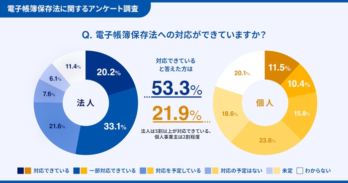 法人では「対応できている」「一部対応できている」との回答が53.3%と、半数以上が電子帳簿保存法に対応していることがわかりました。一方、個人事業主では、21.9%と2割程度にとどまりました。