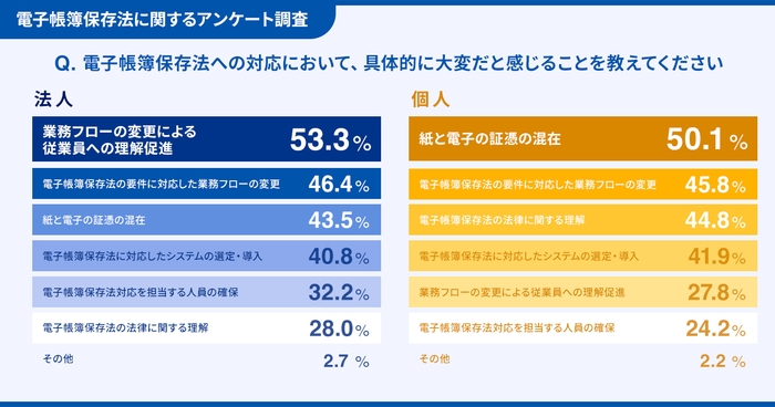 ・電子帳簿保存法への対応で大変に感じるポイントについて、法人の1位は「従業員への理解促進」、個人事業主の1位は「紙と電子の混在」であった。