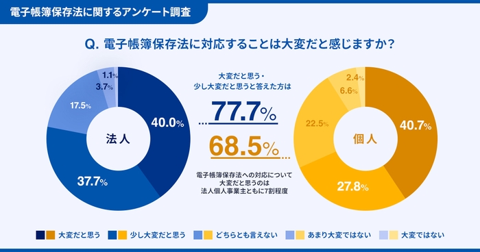 ・法人・個人事業主ともに約7割が「電子帳簿保存法への対応は大変」と回答