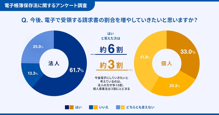 今後、電子で受領する請求書の割合を増やしていきたいと思いますか?という設問に対し、法人では「はい」が61.7%と6割以上であるのに対し、個人事業主では「はい」が33.0%と、電子化への意向に差が見られました。