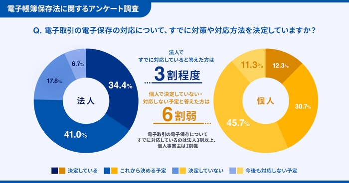「電子取引」の電子保存について、対応方法を「決定している」との回答は法人でも34.4%にとどまりました。また、個人事業主については「決定していない」「今後も対応しない予定」が合わせて6割弱でした。受領した電子の請求書を、何を用いどのように保管するのか、多くの事業者が対応を決めかねていることがわかりました。