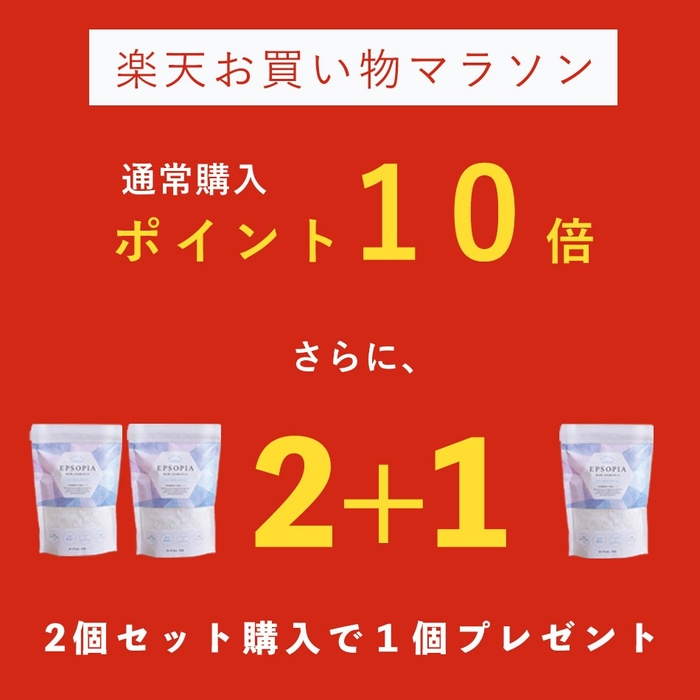 エプソピア楽天市場店は完全無添加のバスソルト『エプソピア』をおトクに購入いただくために、2025年8月24日(日)20:00~2025年8月27日(水)09:59 の楽天お買い物マラソン期間に合わせて、2個セットに1個プレゼントの企画を開催。さらに期間中は通常購入がポイント10倍。
