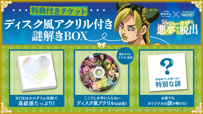 世界中で1,090万人以上を動員しているリアル脱出ゲームを企画運営する株式会社SCRAP(本社:東京都渋谷区、代表:加藤隆生)は、リアル脱出ゲーム×アニメ「ジョジョの奇妙な冒険 ストーンオーシャン」『ジョジョの奇妙な悪夢からの脱出』のオリジナルグッズとカフェメニューの販売について発表いたします。