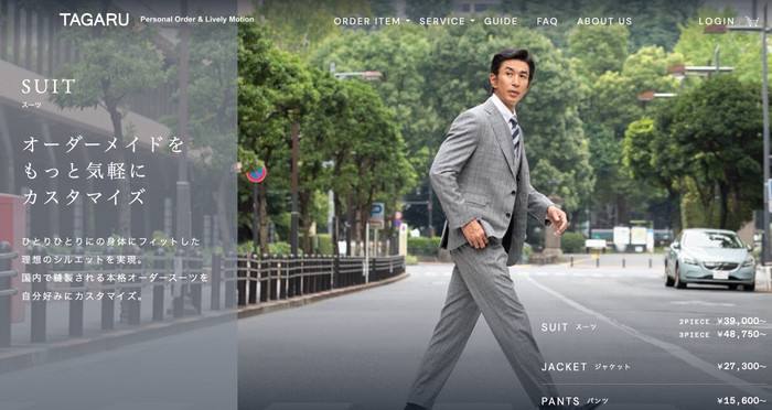スーツだけでなくカジュアルからタキシードまで選べるアイテムの範囲は広く、生地・裏地・釦・デザインなど選択肢の多さでこだわりの1着が注文できる。分かりやすさ重視の為に多くのECサイトでは簡略化されるオプション数を、TAGARU ECサイトでは豊富に反映させることでオンライン上でも店舗さながらの満足感を得ることができる。細部にわたるデザインまでも可視化させることで仕上がりイメージが分かりやすく、こだわりを反映させたカスタマイズを注文することができる。