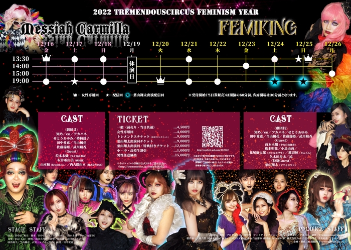 ※『メサイア・カーミラ』12月17日 (土)19:00、『Femiking』12月24日 (土)19:00、12月25日 (日)19:00の回にて、有料ライブ配信+2週間のアーカイブを予定しております。