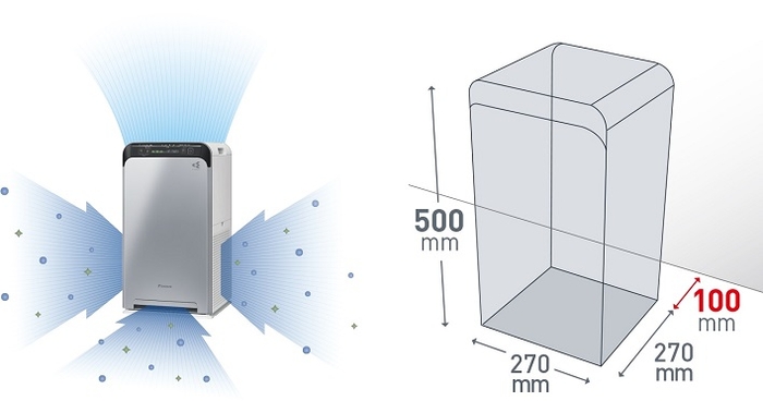 幅と奥行きが27cmの設置面積で狭い部屋に設置しやすく、高さ50cmで圧迫感を感じづらいデザインを採用しました。正面側の左右と下に吸込口を配置し、壁際への設置も可能です。
